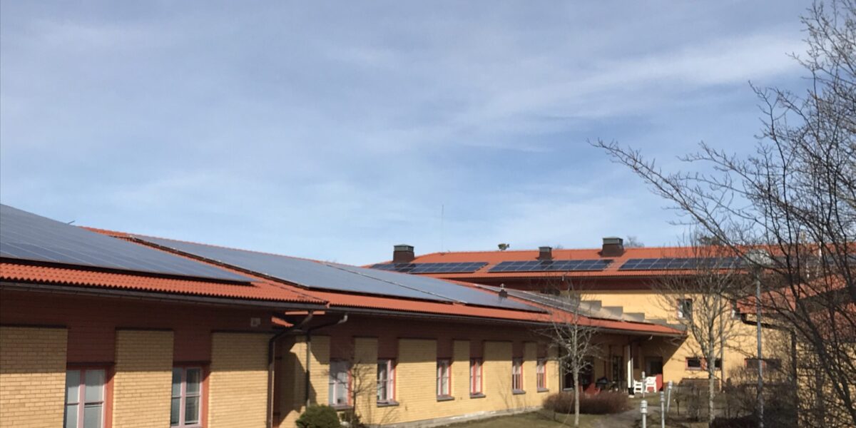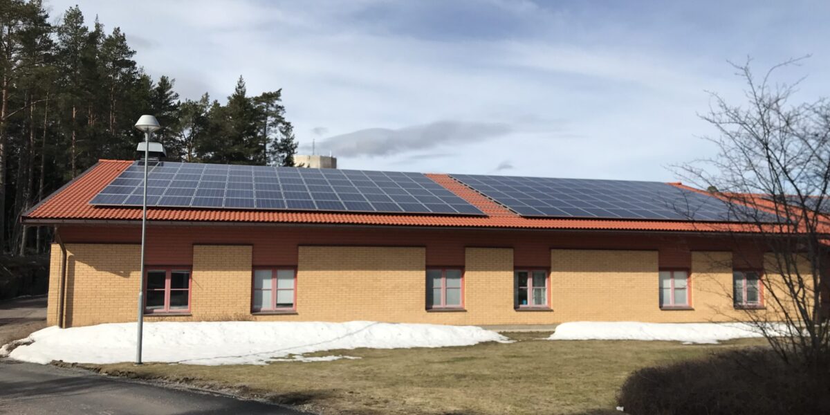 Solcellsanläggning vid vårdcentralen i Östhammar omfattar polykristallina solceller monterade över tegeltak samt en plattmonterad tunnfilmsolcellsanläggning på ett tjärpappstak.
